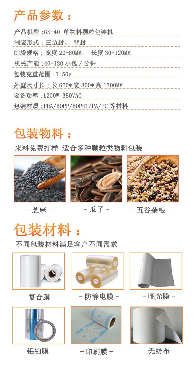 廣泛適用于食品類、五金類、農(nóng)產(chǎn)品類、日化類、醫(yī)藥類等多個(gè)行業(yè)領(lǐng)域的顆粒類、不規(guī)則類產(chǎn)品的包裝